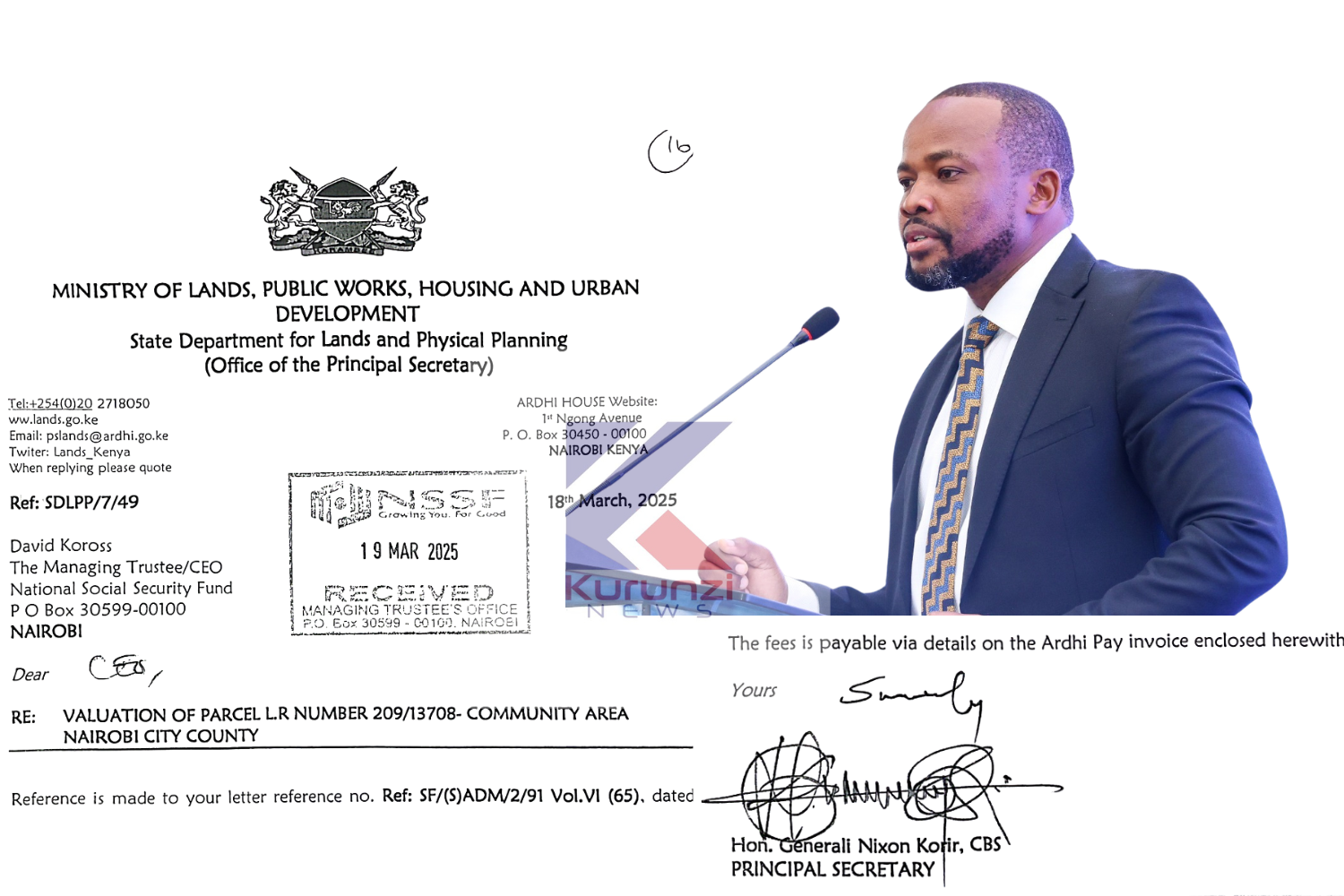 Ministry of Lands valuation report is accompanied by a covering letter by Principal Secretary Nixon Korir, dated 18 March 2025, reference number SDLPP/7/49, attaching a valuation fees invoice (invoice number WA3H4XKS26) of KSh781,250, payable through ArdhiSasa.