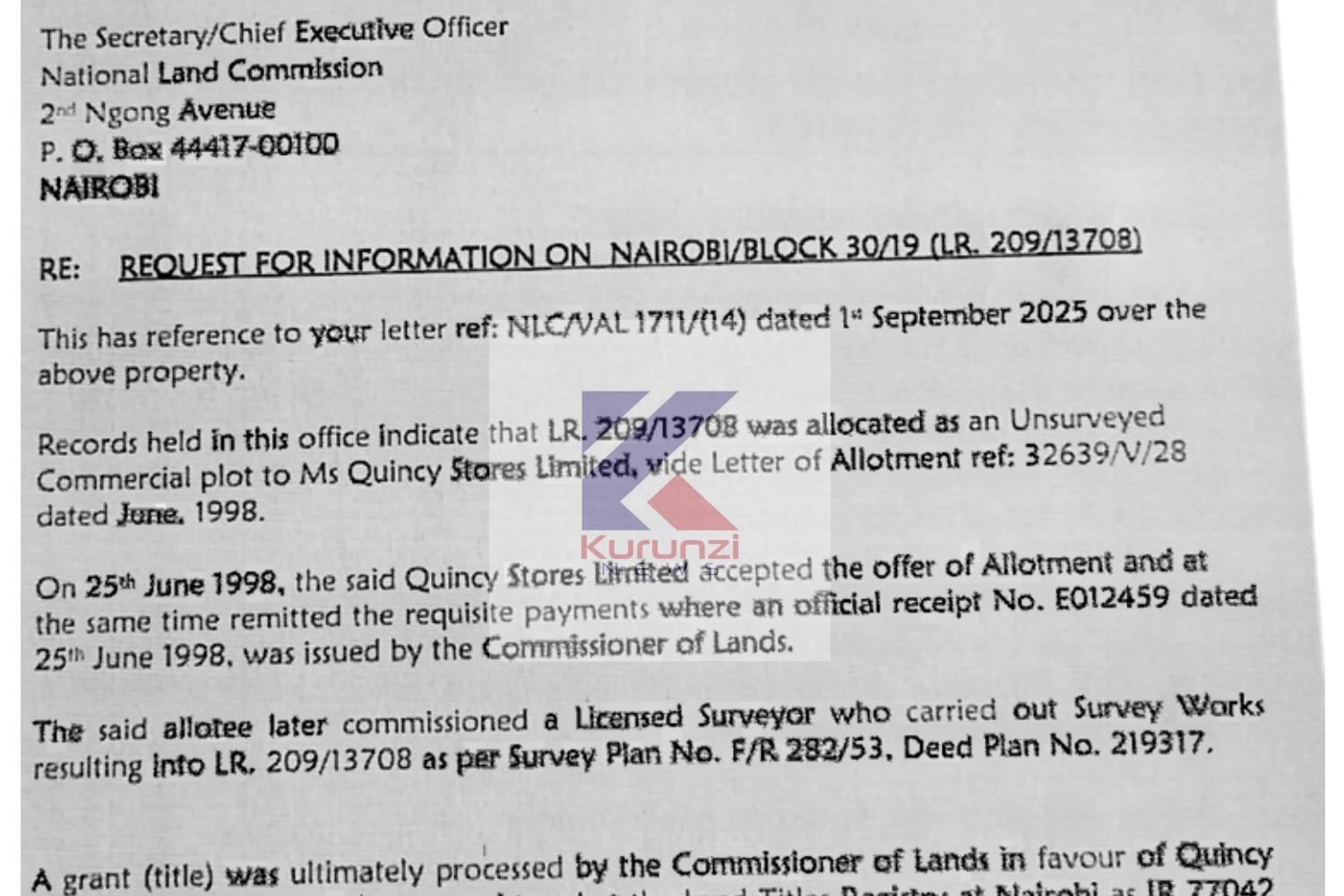 Labor Cabinet Secretary Alfred Mutua initiated the request for compulsory acquisition via a letter to then NLC chairman Gershom Otachi, dated 7 May 2025, meaning this compensation process took just under six months from start to finish, which is a big departure from the average timeline this takes.