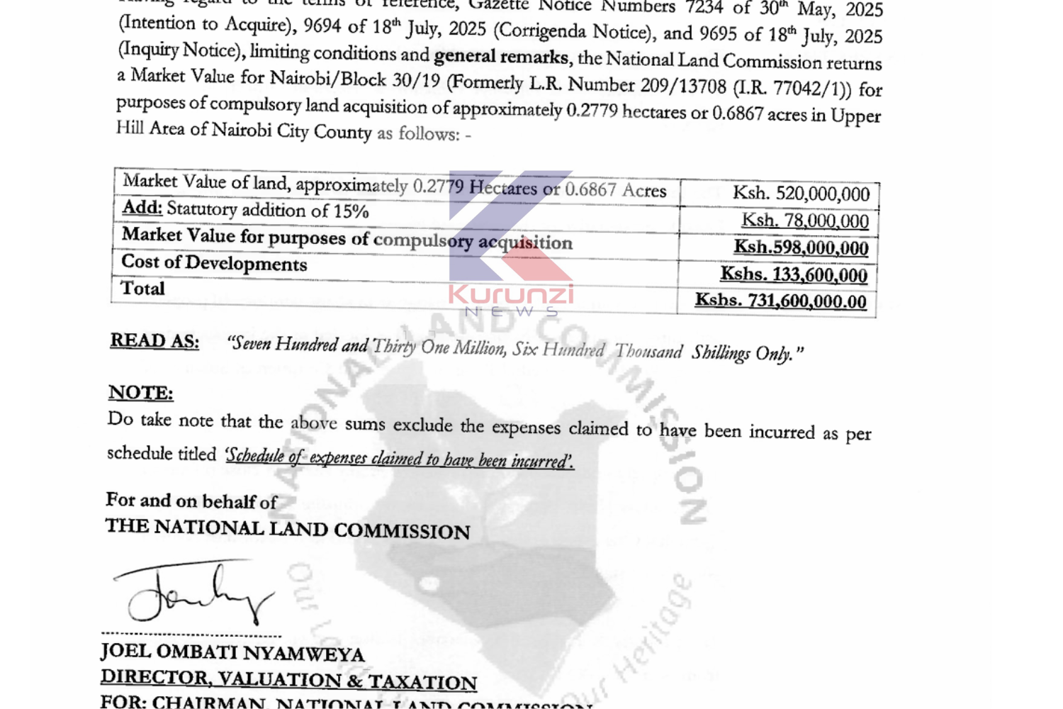 On 23 September 2025, the NLC valuation and taxation committee presented its final report, which contained the certificate of value at KSh750 million per acre. This means that the 0.7 acres translated to KSh520 million.